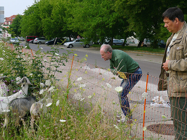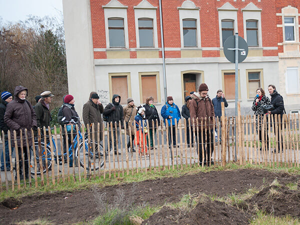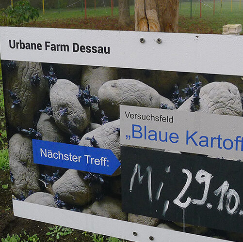 Wenn eine Stadt schrumpft, ist plötzlich viel Platz da. So auch in Dessau. Im Quartier Am Leipziger Tor herrscht viel Leerstand – für die Pflege der Anlagen fehlt das Geld. Mit der Idee, die kargen Rasenflächen zwischen den Plattenbauten in einen Stadtbauernhof zu verwandeln, konnten dennoch nicht alle Anwohner sofort etwas anfangen, sagt Heike Brückner: „Sie wollten keinen Acker vor dem Fenster“. Also pflanzten die neuen Stadtbauern auf den 400 Quadratmetern nicht nur Kartoffeln, Salat und Möhren sondern auch jede Menge Blumen. Erste Ernte: 120 Kilogramm Blaue Schweden, eine alte Kartoffelsorte. Das war 2014. Mittlerweile arbeiten beim wöchentlichen Gärtnertreff regelmäßig zwischen drei bis dreizehn Freiwillige in der Urbanen Farm. Darunter „mal Jugendliche mit Streetworkerin, mal eine Gruppe Afrikaner“, sagt die Projektleiterin Brückner. Die Landschaftsarchitektin hofft, dass mit einem geplanten Gewächshaus auch die Erträge steigen. Eine solarbetriebene Pumpe soll in Zukunft das Wässern erleichtern. Langfristig möchte Brückner den Stadthof wirtschaftlich so rentabel machen, dass ein Gärtner eingestellt werden kann. Noch wächst die Farm mit Hilfe von Spenden – unter anderem von Gastronomen, die dafür Teile der Ernte bekommen. Kartoffeln vom Stadthof nebenan: Lokaler geht’s wirklich nicht.
